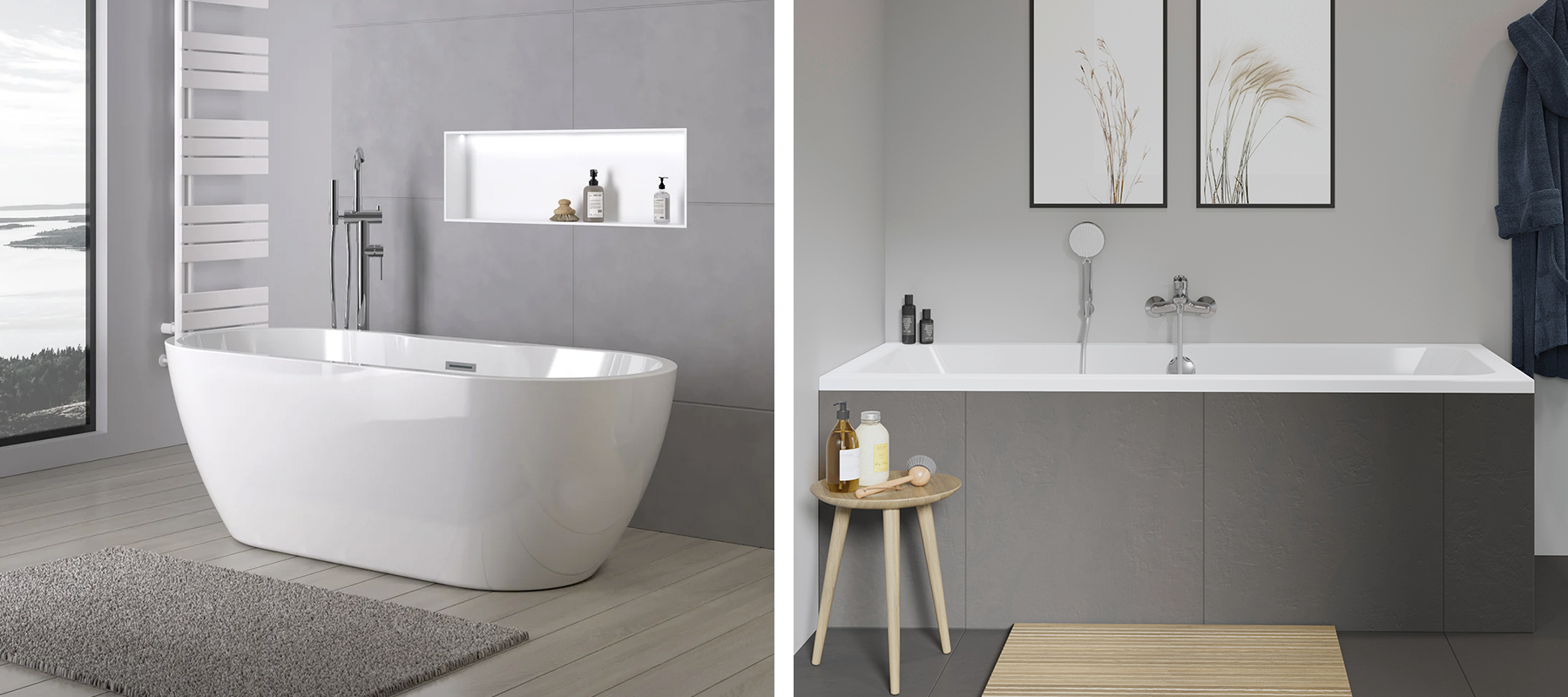 4. Alcove: An alcove stone bathtub is installed in a three-walled enclosure, with one end of the bathtub exposed.