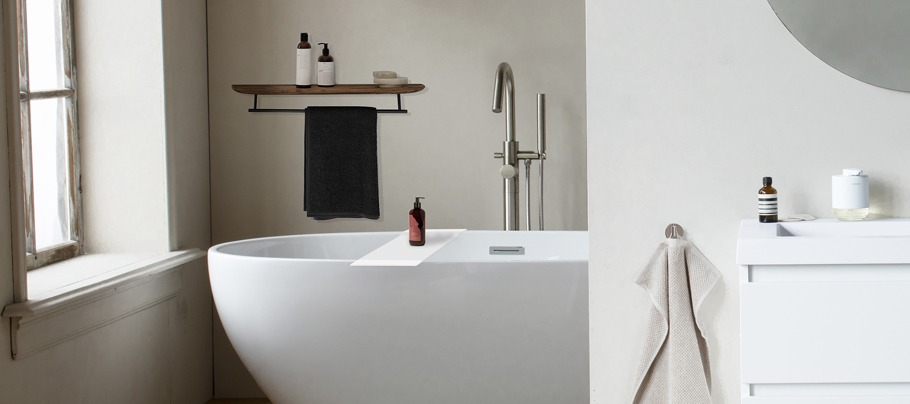 Eqwep's expert design team has meticulously selected a wide range of top-tier brands that have exceptional reviews of luxury bathtub accessories. Immerse yourself in luxury with the Bernstein BAMBUS Bathtub Tray in Natural Oak. Crafted from high-quality bamboo material, this waterproof tray adds elegance to your bathroom, while its compact size of 85(W) x 16(D) cm ensures versatility. The Matt White Bathtub Tray, made from solid surface material, offers sophistication and easy maintenance, fitting most bathtubs perfectly with its 85(W) x 16(D) cm size. Complete your bathroom with the stylish and functional Bernstein Floor Standing Towel Rack in Matt White, and enhance relaxation with the Caēli Natural Aromatherapy Candle's woody oriental scent notes. Elevate your bathing experience with Eqwep UAE's premium bathtub accessories.