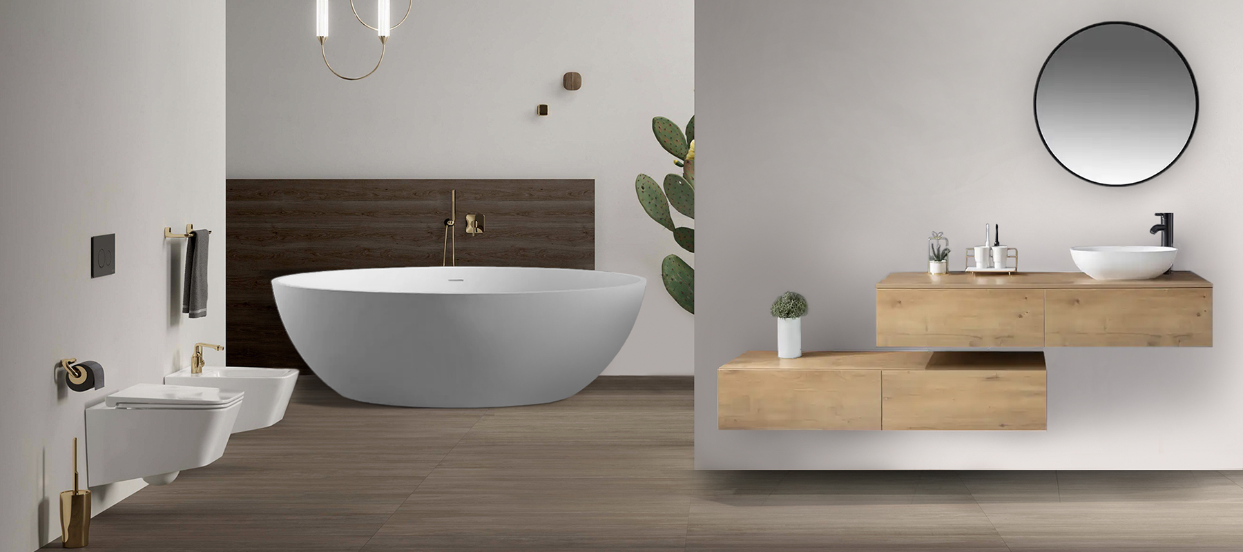 Luxury bathroom cabinets are a great way to add storage facility and a luxurious feel to the bathroom experience, such as the Bernstein Full Set Bathroom Furniture, water-Proof Wooden Cabinet 180(W) cm including two solid stone wash basins 54(W) cm, basin siphons and fixing parts, available in Concrete Grey and Natural Oak color. Moreover, 5-star hotels often have a separate toilet/water closet area for added privacy, and a bidet in the bathroom is becoming a standard in luxury hotels.