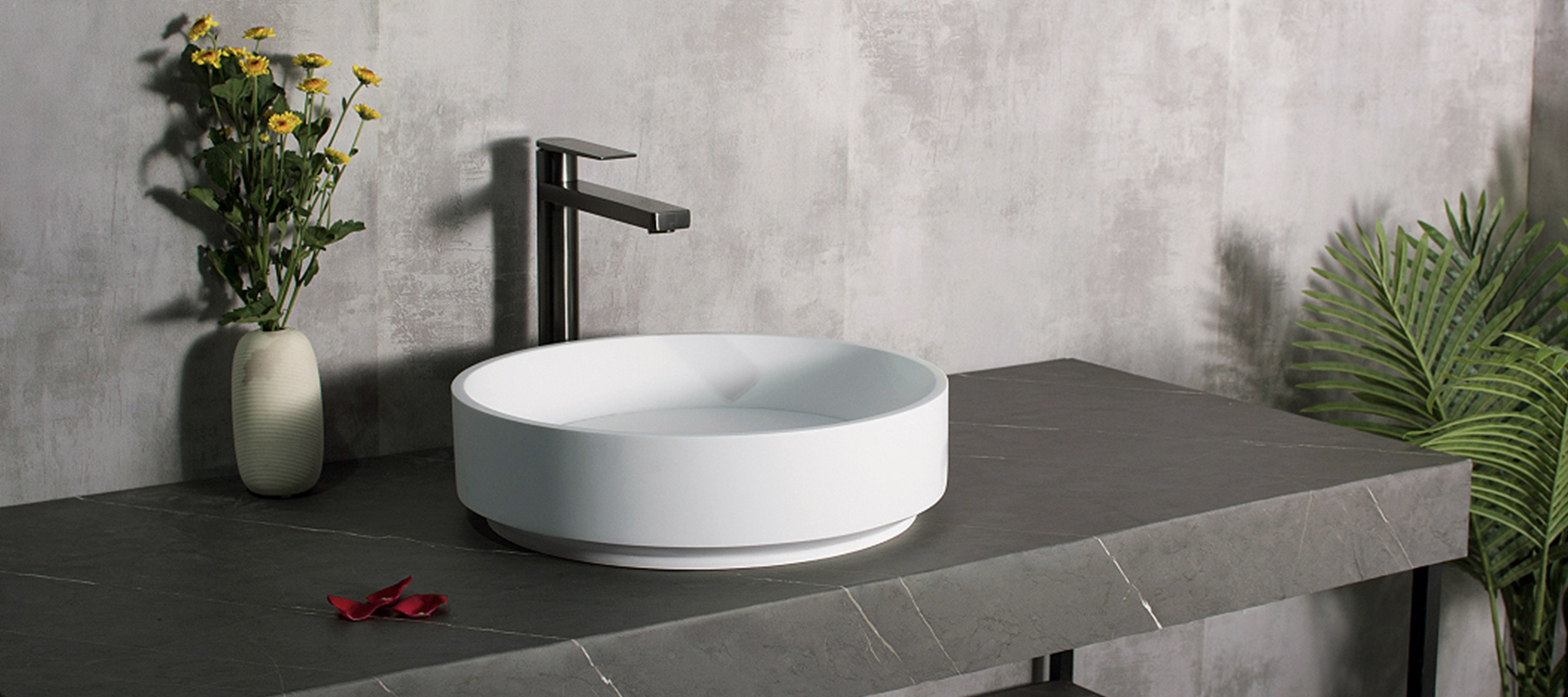 The Bernstein Countertop Washbasin is a unique and stylish addition to any bathroom, with its round shape and stunning design. Measuring 42cm in width and made of high-quality solid stone in a matt black exterior and classic white interior, this washbasin is easy to install and comes complete with a waste set, siphon (bottle trap), and fixing kit. The smooth, non-porous surface is highly hygienic and easy to maintain, while its good thermal insulation makes it heat-resistant. Optional expert installation by certified professionals is also available for a hassle-free setup. With its premium quality and modern design, the Bernstein Countertop Washbasin is the perfect choice for those seeking a sophisticated and unique bathroom.